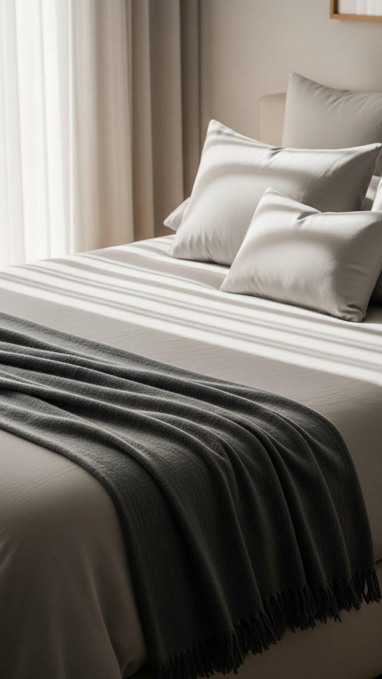 Layer a single, well-chosen throw and a few minimal pillows to give your bed instant texture and intention.