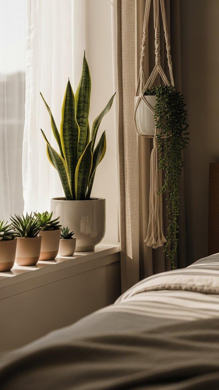 Bring a few low-maintenance plants into your bedroom to soften hard lines and introduce living texture without adding upkeep stress. Choose air purifying succulents on a windowsill and a sculptural snake plant in a corner for clean, carefree vibes. Suspend a hanging plant macramé to free floor space and add vertical interest, letting greenery enhance calm and portable freedom.