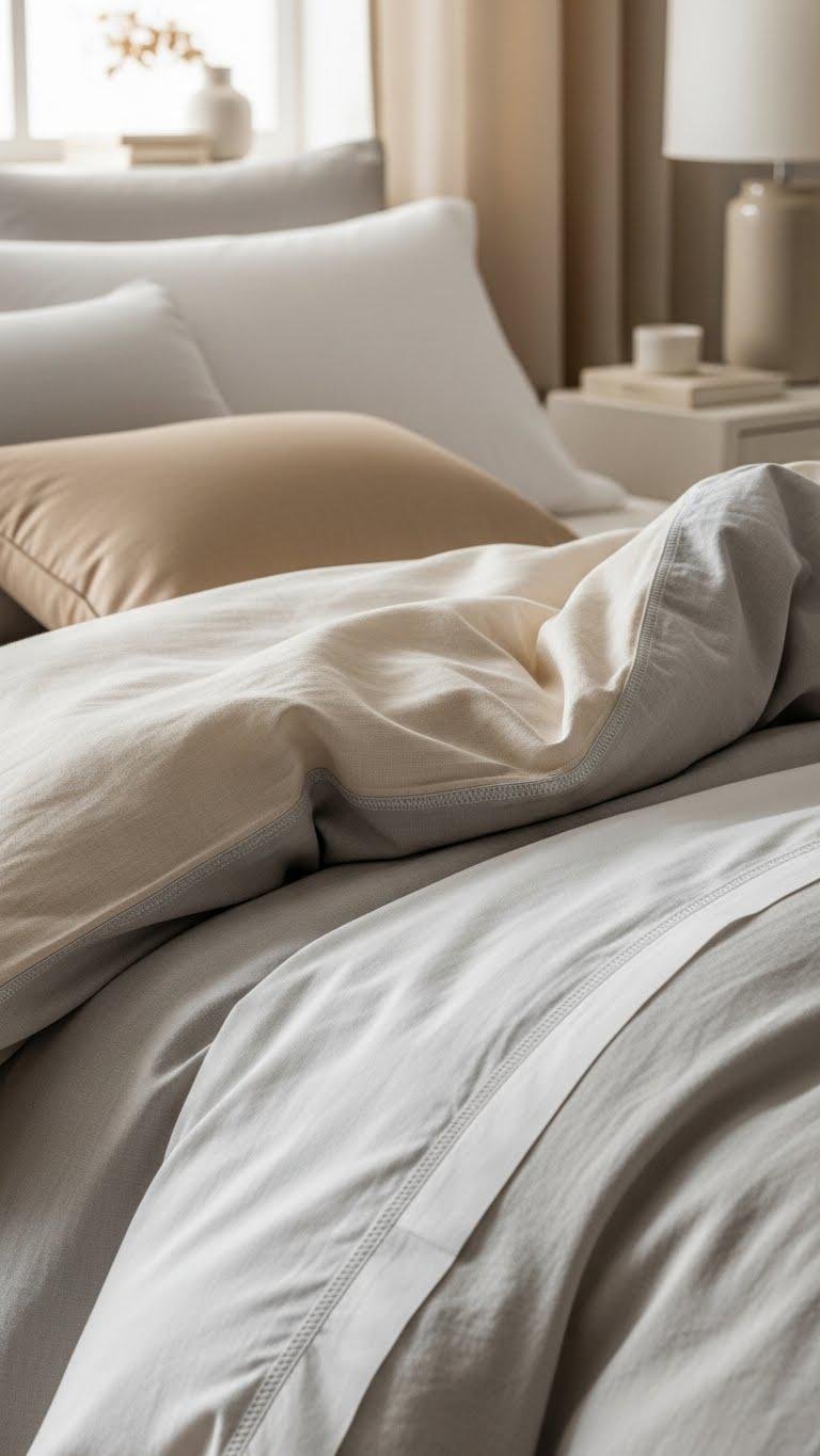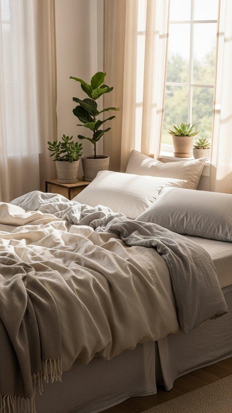 After you’ve softened the room with low-maintenance greenery, choose bedding that keeps that airy, relaxed feeling—lightweight linen or cotton breathes, regulates temperature, and wears beautifully over time.