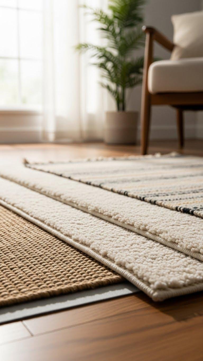 Layer rugs to add instant warmth, acoustic dampening, and visual interest underfoot. You’ll mix textures—natural jute, plush shag, a patterned runner—anchoring zones while staying light on space. Add a discreet thermal underlay for insulation and comfort; overlap edges neatly, balance scale and color, and let layered rugs express your independent, uncluttered style while improving feel and sound.
