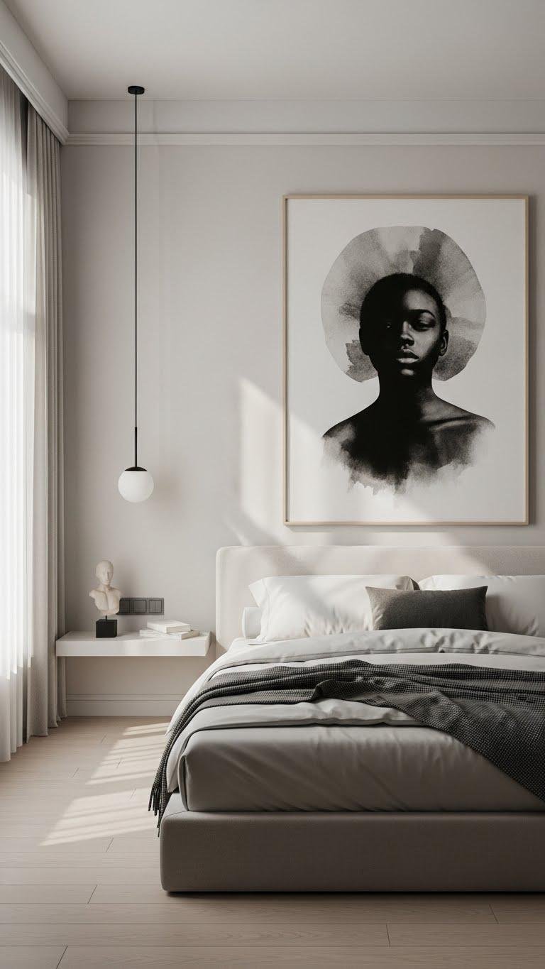 You’ll choose a large scale piece—perhaps an oversized monochrome print—so the room breathes. Place it above the bed, balance with a minimal sculpture on a narrow shelf, and keep surrounding decor restrained to preserve openness and freedom.