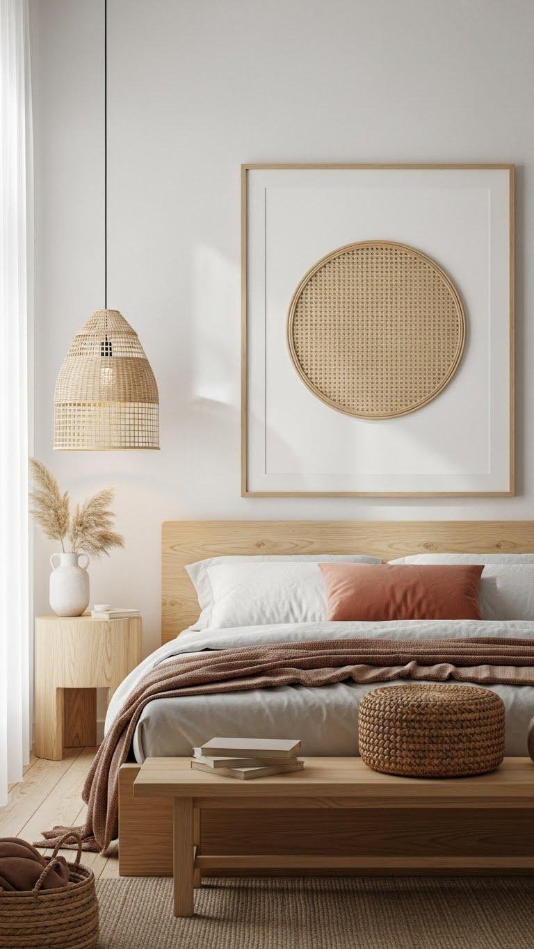 After you’ve pared walls back with a single large art piece, introduce natural texture through woven or rattan accents to warm the space and add tactile interest. You’ll layer a rattan wall art piece above the bed, add a woven pendant for soft ambient light, and choose pared-back furniture. These choices feel liberated, tactile, and quietly modern without overwhelming your calm.