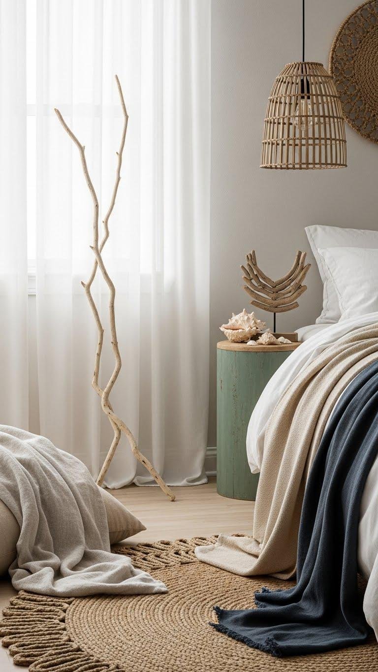 A woven jute rug or a simple strand of driftwood can quietly steer your bedroom toward a coastal mood without turning it into a theme park — pair those tactile accents with a restrained palette of sandy beiges, sea-glass greens, and soft navy to suggest shorelines rather than mimic them.