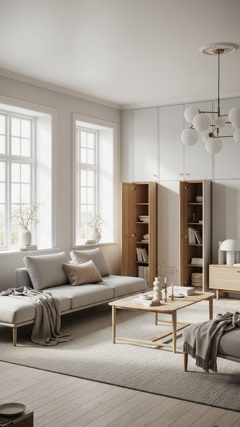 While you pare the room back, focus on light, texture, and function to create a serene Scandinavian feel — think pale walls, streamlined furniture, and a few layered textiles that add warmth without clutter.