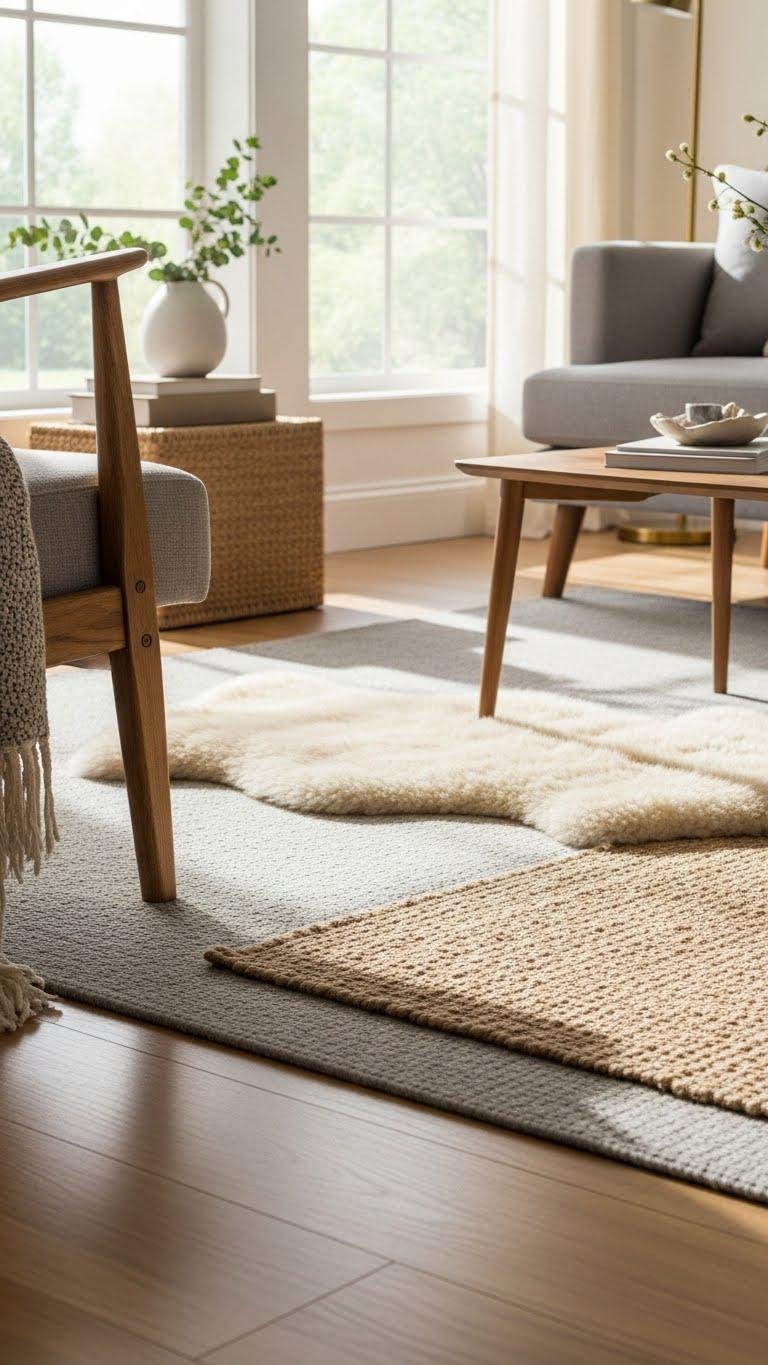 Often an oversized area rug becomes the single element that ties the whole room together, grounding furniture and softening hard floors underfoot. You’ll pick a scale that complements traffic flow, mixing texture—plush sheepskin accents over a low-pile base or layered jute for contrast—to create warmth and freedom of movement. Choose muted tones and crisp edges to keep the look modern and effortlessly relaxed.