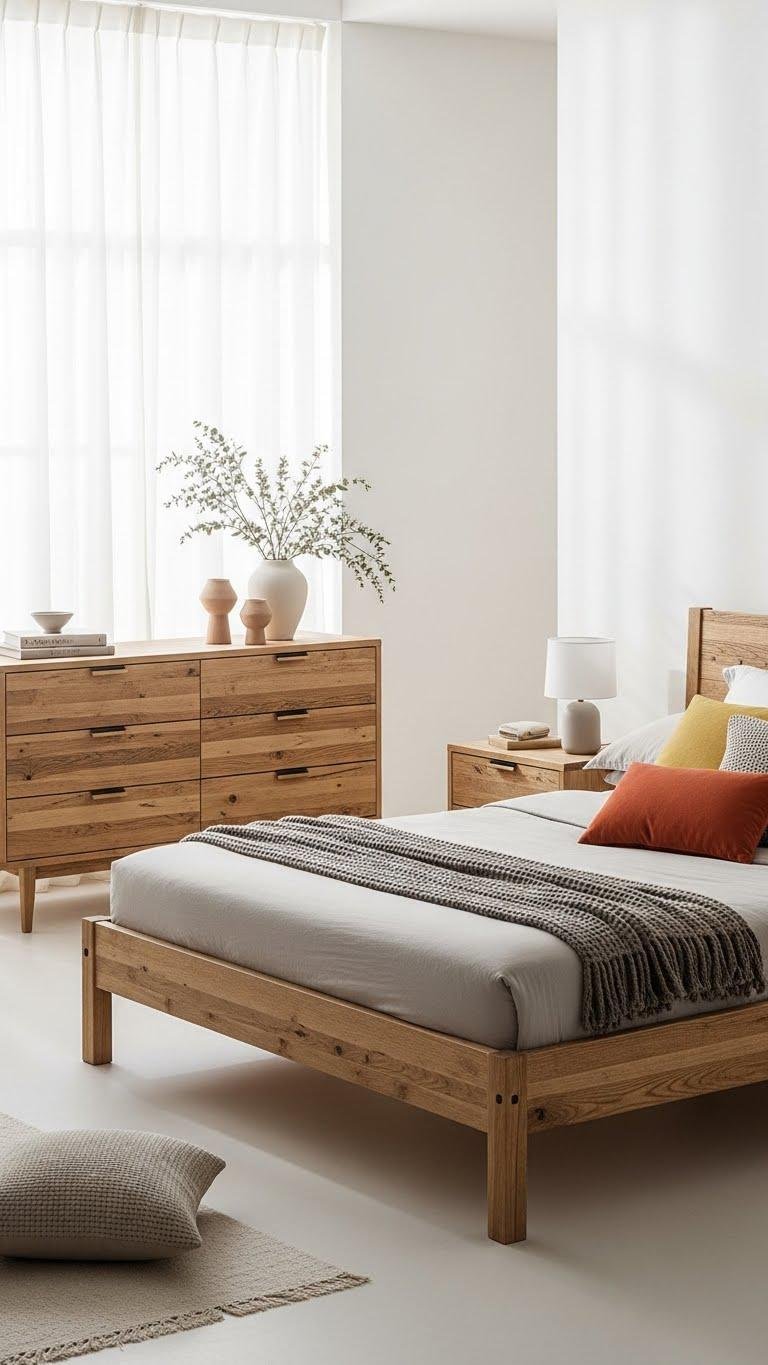 You’ll choose reclaimed timber for character and sustainability, pairing clean-lined dressers and bed frames with subtle bamboo accents for lightness. Keep finishes matte, hardware minimal, and arrange pieces to free circulation so your space feels airy, intentional, and liberated.