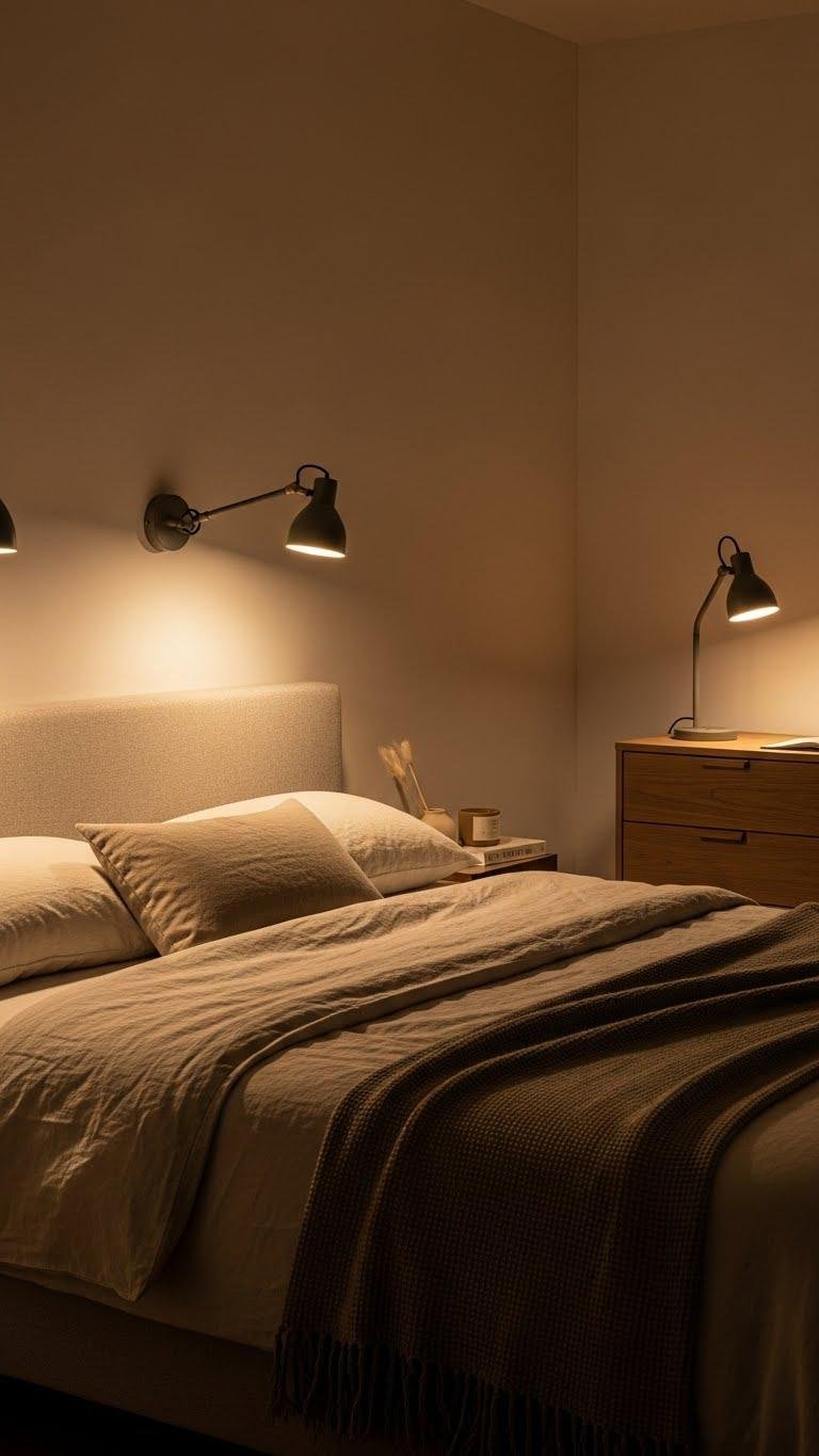 You’ll choose adjustable sconces by the bed and focused task lamps on your dresser or desk, giving directional light where you need it. Opt for slim, matte finishes and warm LEDs so lighting stays functional, minimal, and freeing without overwhelming the room’s calm, curated vibe.