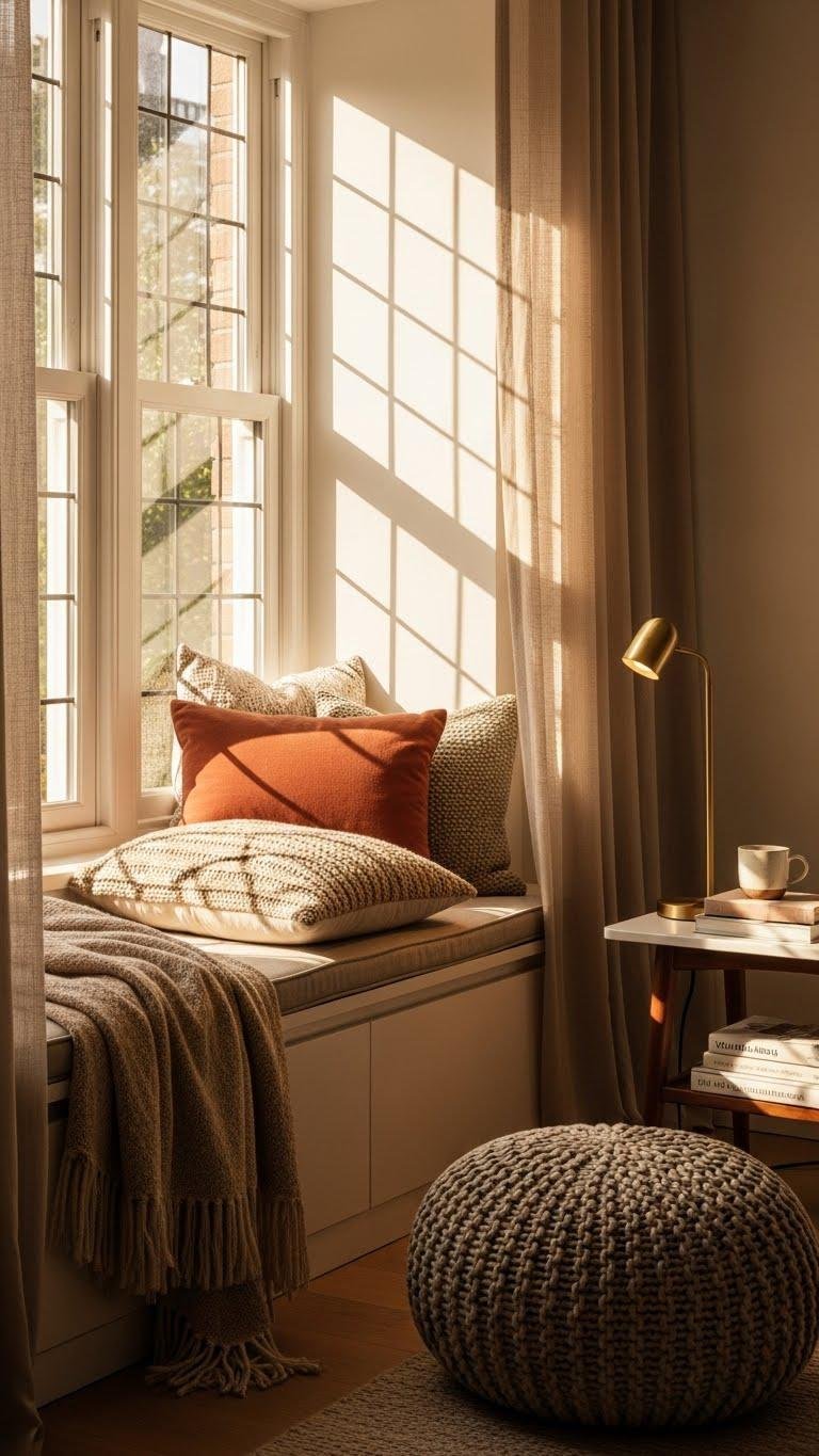 Tuck a dedicated reading nook into an unused corner or beside a sunlit window to give yourself a quiet, intentional spot for books and relaxation. Choose a streamlined window seat with storage, layer textured throws, and add a compact lamp for focused light. Include a sculptural floor pouf and a slim side table so you can lounge freely while keeping clutter minimal and purposeful.