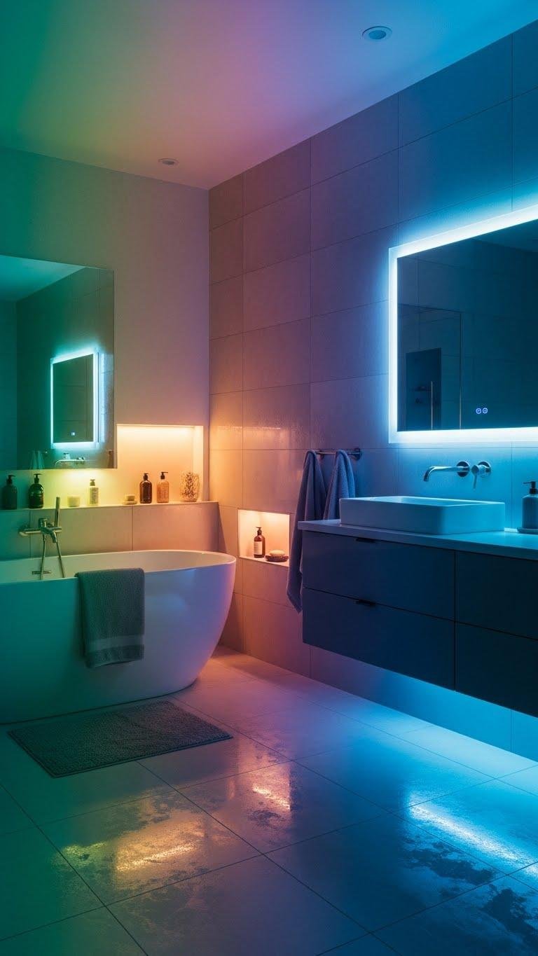 You’ll find chromotherapy lighting turns a bathroom from simply functional into a mood-tuned sanctuary by bathing the space in adjustable hues that influence relaxation and energy.