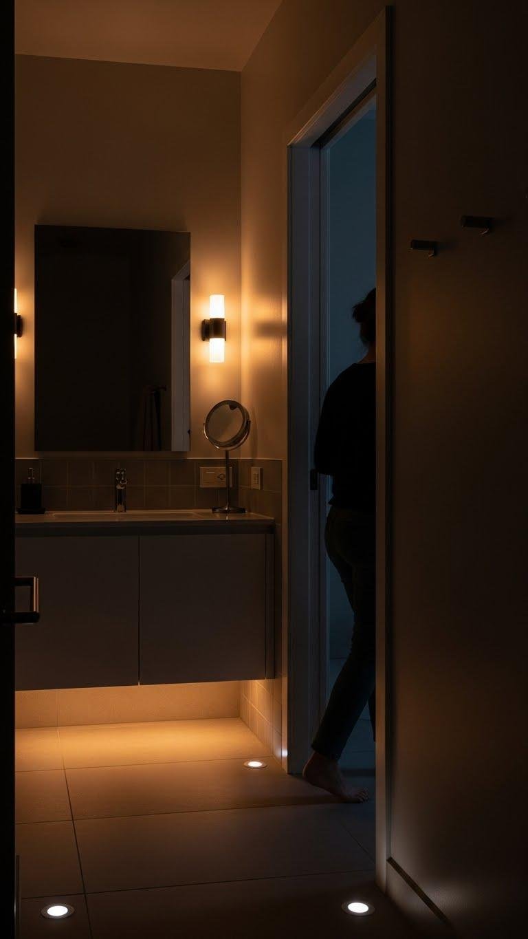 You’ll install motion activated sconces by the vanity and discreet ambient pathway lights along the floor or under cabinets, creating safe, serene routes. They save energy, feel effortless, and let you move freely without harsh overhead glare.