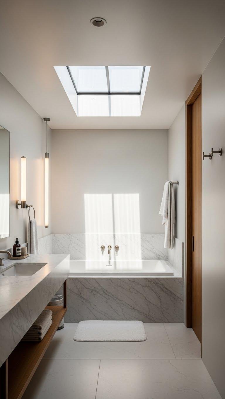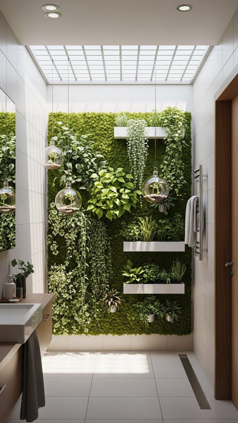 Bright, natural light from a skylight or solar tube makes a living green wall sing, turning a bathroom corner into a spa-like focal point. You can install moss panels for low-maintenance texture, mix in hanging terrariums for depth, and arrange potted herbs for scent.