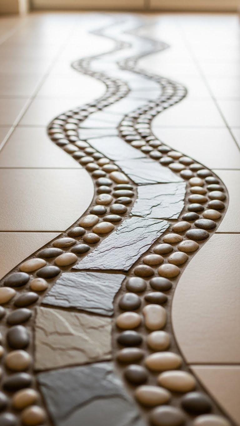 Bring in natural texture by laying a strip or patch of river stones or cut slate amid your tile to create a tactile, grounding focal point underfoot.