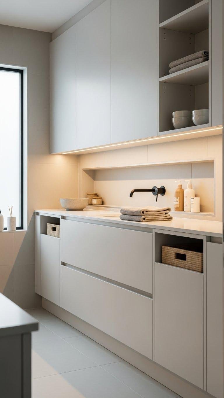 A single run of built-in linen cabinets can quietly transform a bathroom into a calm, clutter-free retreat by hiding towels, toiletries, and bulky storage behind flush, handleless doors. You’ll appreciate the seamless look: recessed niche shelving for display, hidden hampers for laundry, soft-close drawers, and minimalist finishes. Install under lighting and adjustable shelves so your space feels open, orderly, and effortlessly free.