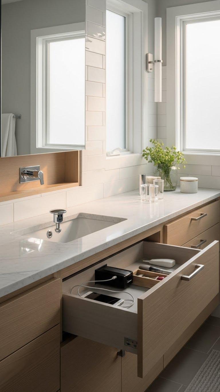 Tuck away outlets and storage so your bathroom stays visually quiet and functionally smart; pop-up plugs, in-drawers charging stations, and recessed medicine cabinets keep counters clear without sacrificing access. Embrace hidden outlets and recessed power for hair tools, and choose pull out cabinetry for toiletries. Concealed storage preserves a calm, liberated vibe so you move freely, clutter-free, enjoying a spa-like simplicity.