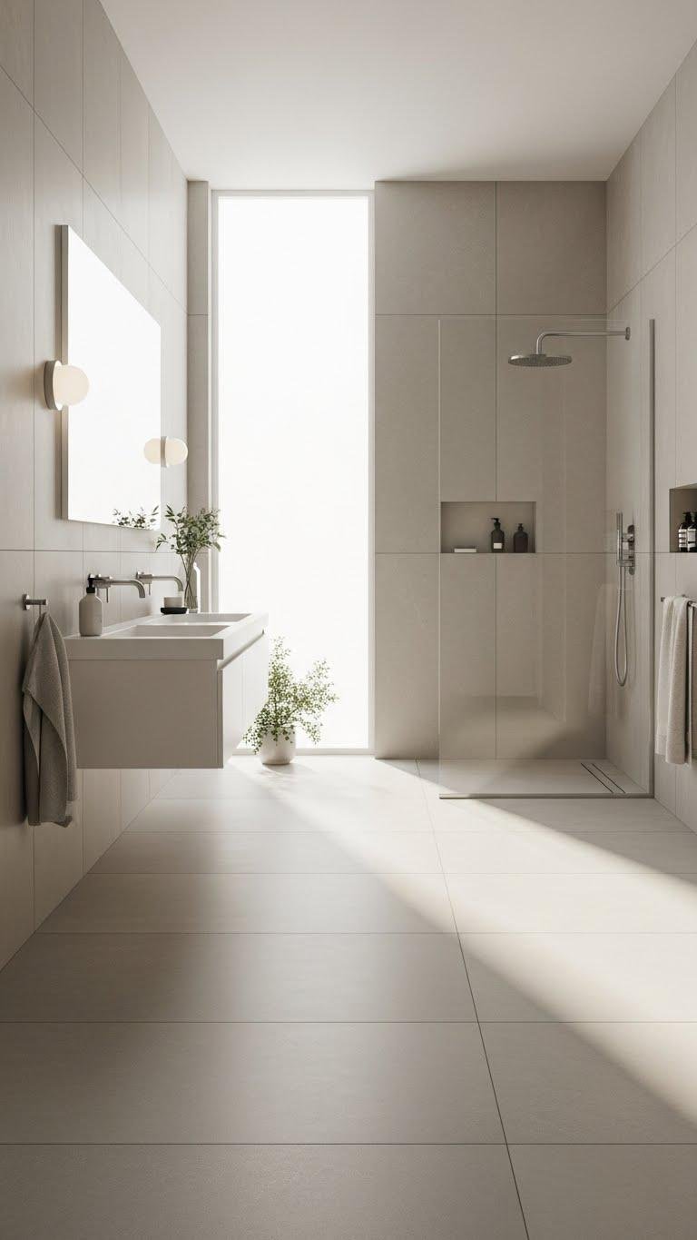 When you choose large-format tiles with minimal grout lines, your bathroom reads cleaner and more expansive—seams almost disappear, letting texture and material take center stage. You’ll favor large tiles for a calm, open feel.