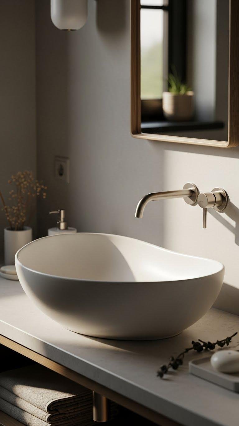 Because curves break the orthogonal rhythm of a bathroom, an organic-shaped vessel sink becomes an instant focal point that feels both sculptural and soft underhand; it invites touch and frames daily rituals.