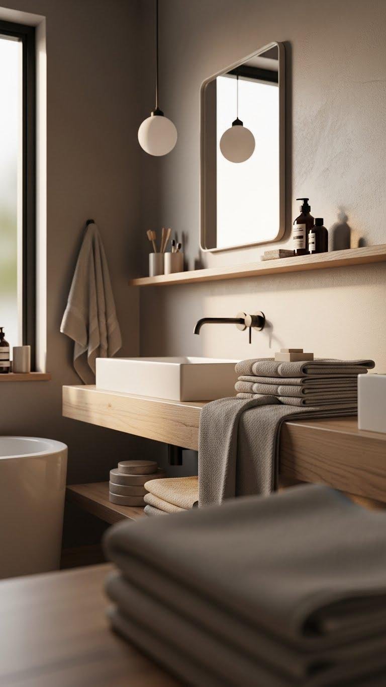 Warm taupe paint palettes ground a bathroom with gentle warmth, blending beige and gray undertones so you get a neutral backdrop that still feels cozy. Choose warm taupe walls to calm the senses, layer textured towels and matte fixtures, and balance light with natural wood.