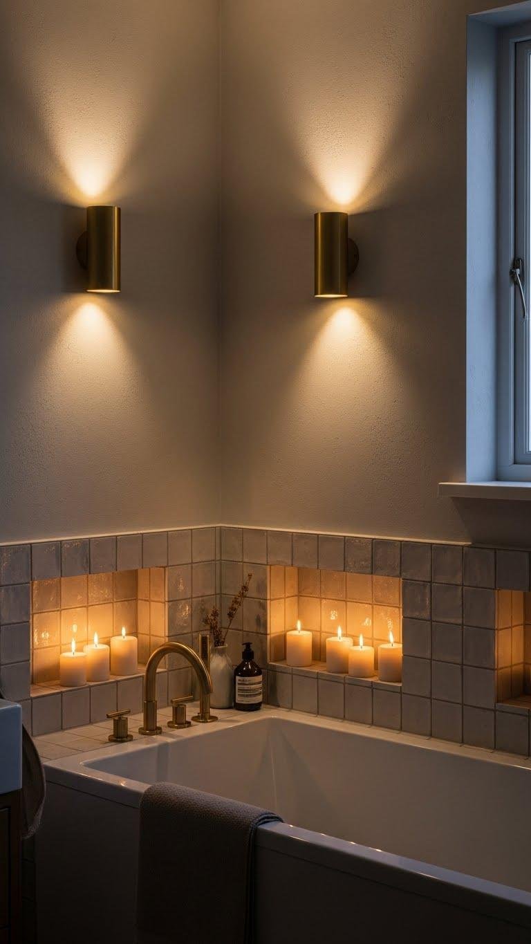 When you layer soft wall light with small built-in candle niches, the bathroom shifts from purely functional to quietly luxurious. Choose matte brass sconces for warm, sculptural accents and pair them with recessed candle niches to keep surfaces clear.