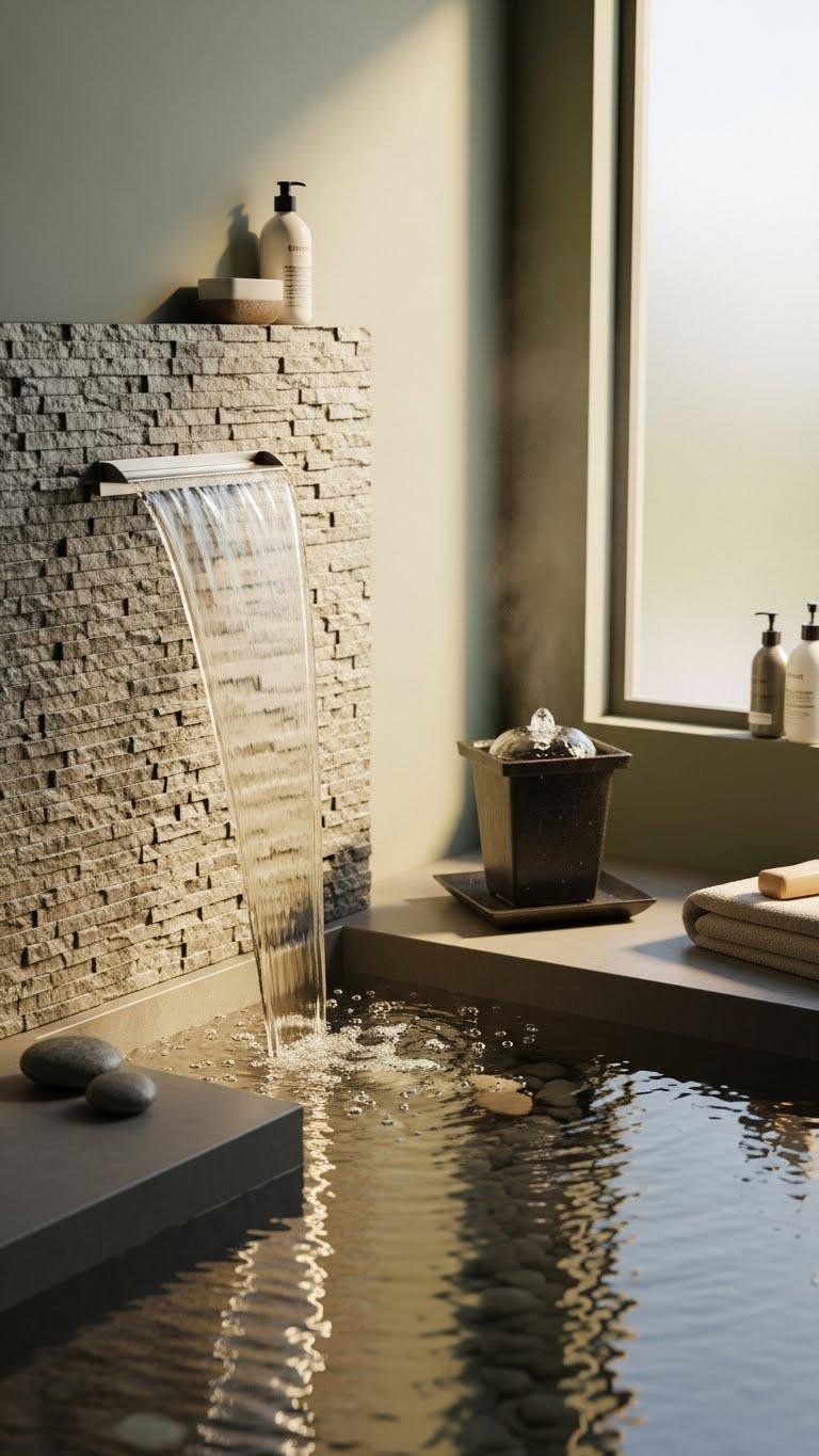 If you want a quiet focal point that soothes the senses, add a compact water feature or indoor fountain to your bathing area. You’ll choose an indoor waterfall for vertical drama or a tabletop fountain for subtle sound. Position near natural light, use low-maintenance finishes, and guarantee splash containment. The result: a liberated, calm retreat that invites slow breathing and daily ritual.