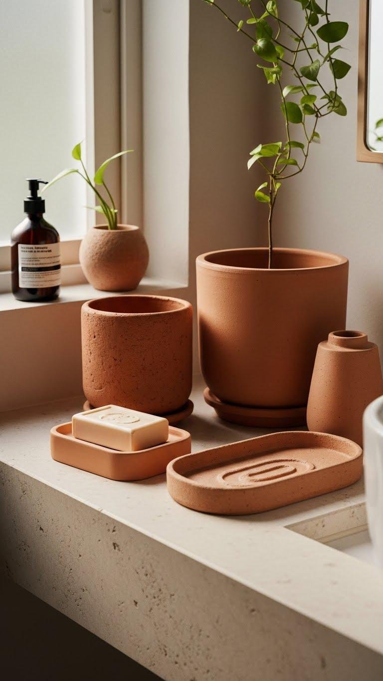 Bring textured clay and terracotta accents into your bathroom to ground the space with warm, organic character.