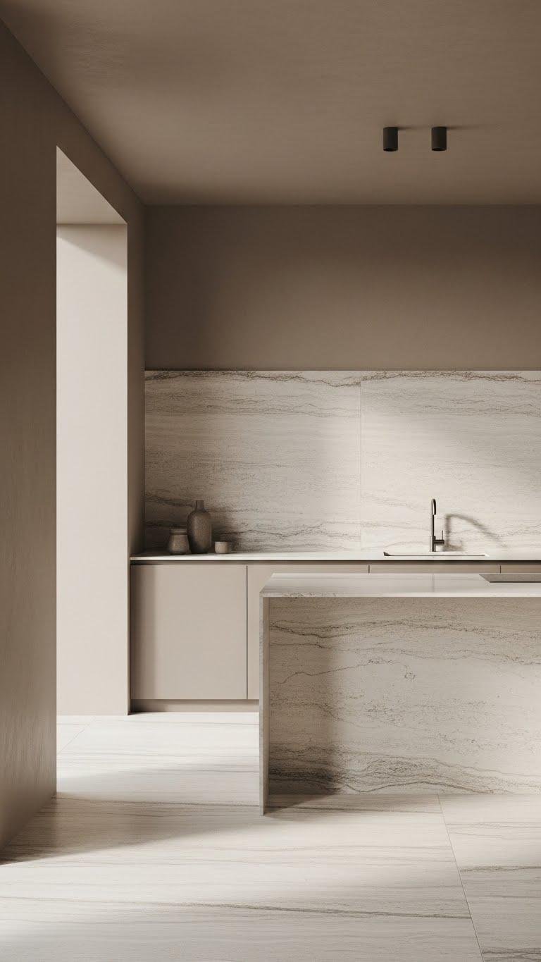 After grounding your walls in warm taupe, bring in large-format natural stone slabs to add sculptural calm and seamless continuity.
