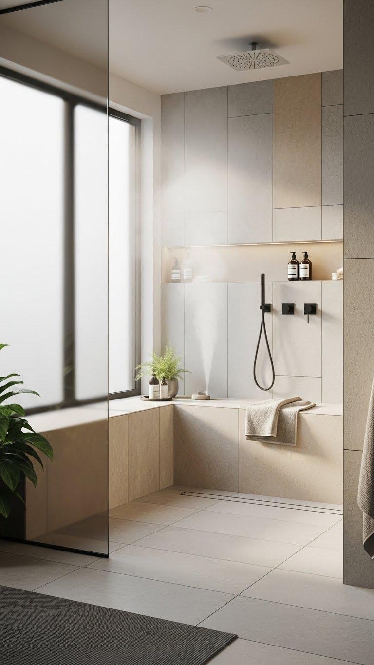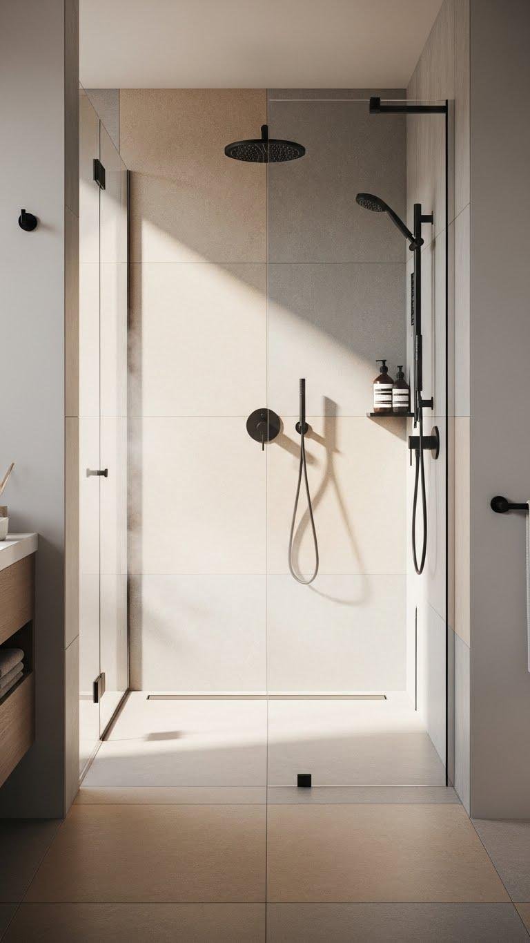 Choose linear curbless drainage, textured tile, and minimalist glass.