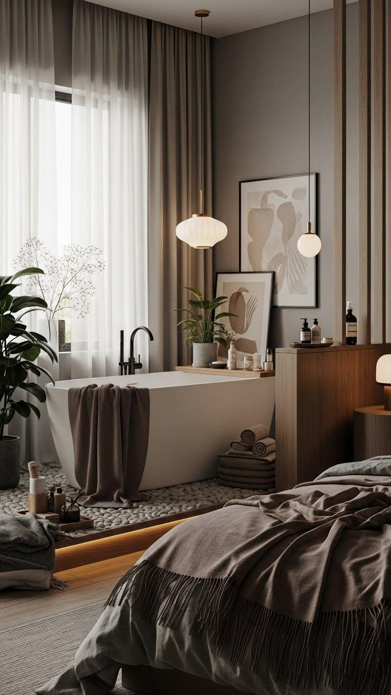 Soft, muted maximalism thrives on tactile comfort and thoughtful placement, and if your bedroom has the square footage, introducing a freestanding or spa-style tub elevates that intimacy into a daily ritual.