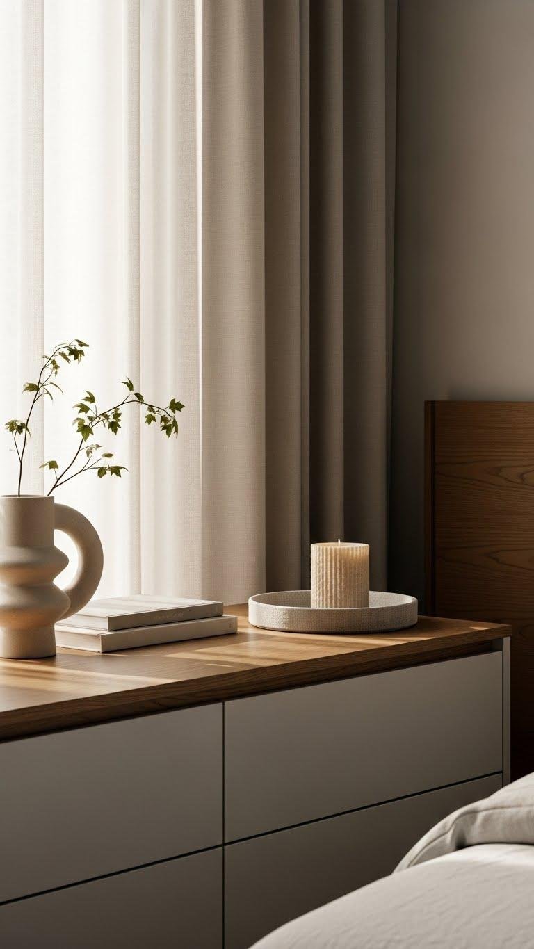 Scent and tactile comfort set the mood, but your surfaces keep that calm feeling intact—clear, curated nightstands and dressers let the room breathe and prevent visual clutter from interrupting rest. You’ll favor a minimal tabletop, embrace curated surfaces and arrange intentional vignettes that tell a simple story. Respect negative space, edit ruthlessly, and let each object earn its place so you feel free.