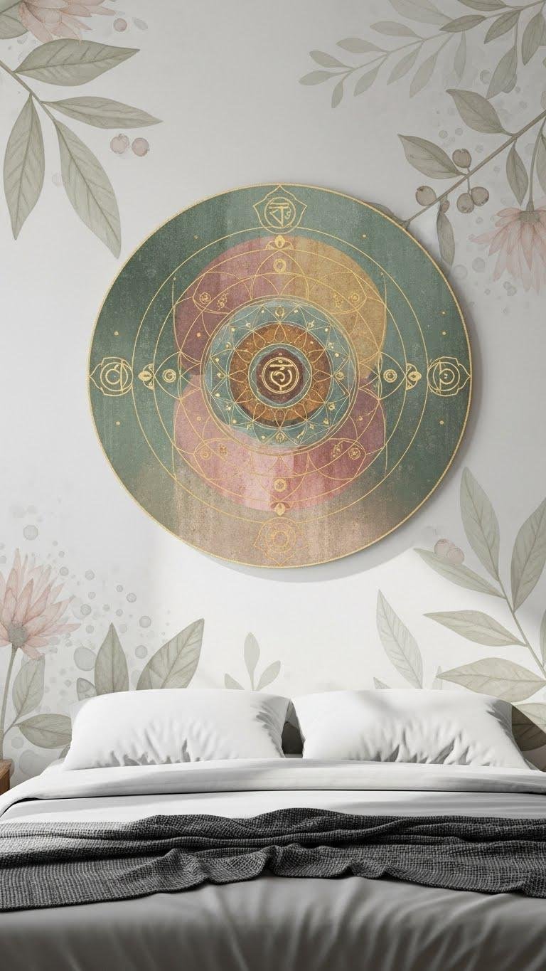 After letting a botanical mural set a calm backdrop, bring in a circular mandala to focus attention and encourage restful stillness. You’ll choose a design rooted in sacred geometry and subtle chakra symbols to guide breath and balance. Hang it at eye level, keep colors muted, and pair with uncluttered bedding so the piece directs meditation without dominating the room.