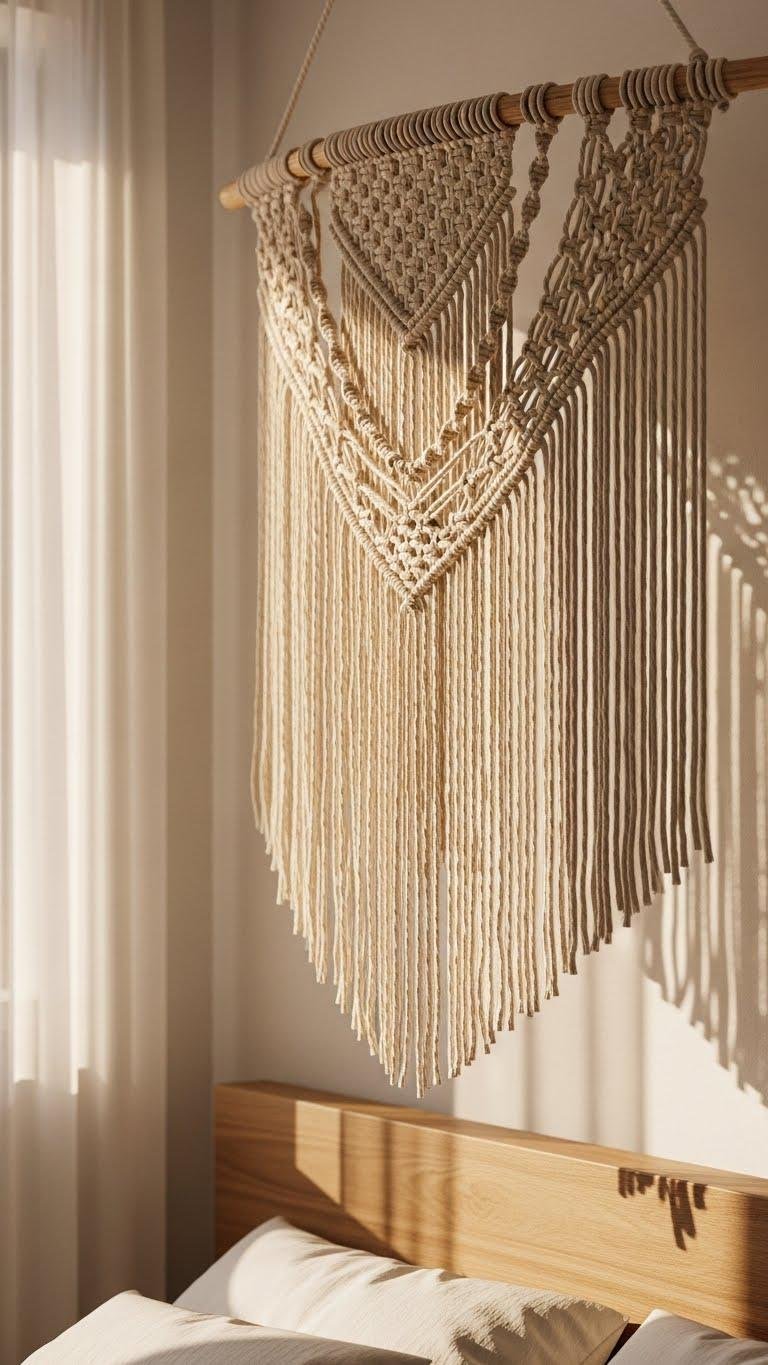 Tucked above the bed, a hanging rattan macramé accent brings organic texture and soft, sculptural rhythm to a peaceful bedroom. You’ll choose a scale that feels freeing, letting woven texture catch light without clutter.