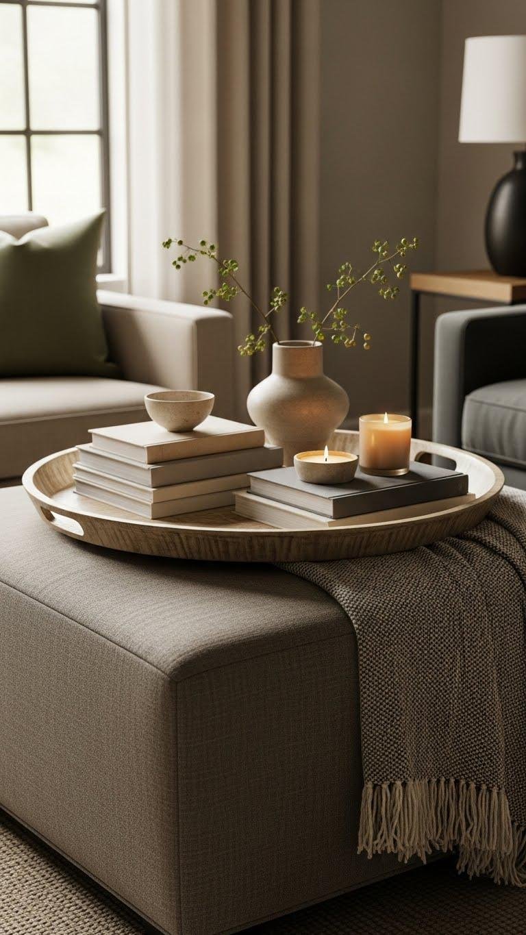 Pull an oversized tray onto your ottoman to instantly create a purposeful, anchored surface that reads like a miniature coffee table. You’ll balance scale on an oversized ottoman, layer books, a low vase, and a candle, and play fabric contrast with a textured throw. The result feels liberated yet curated — a tidy, movable vignette that supports relaxed living and easy rearrangement.