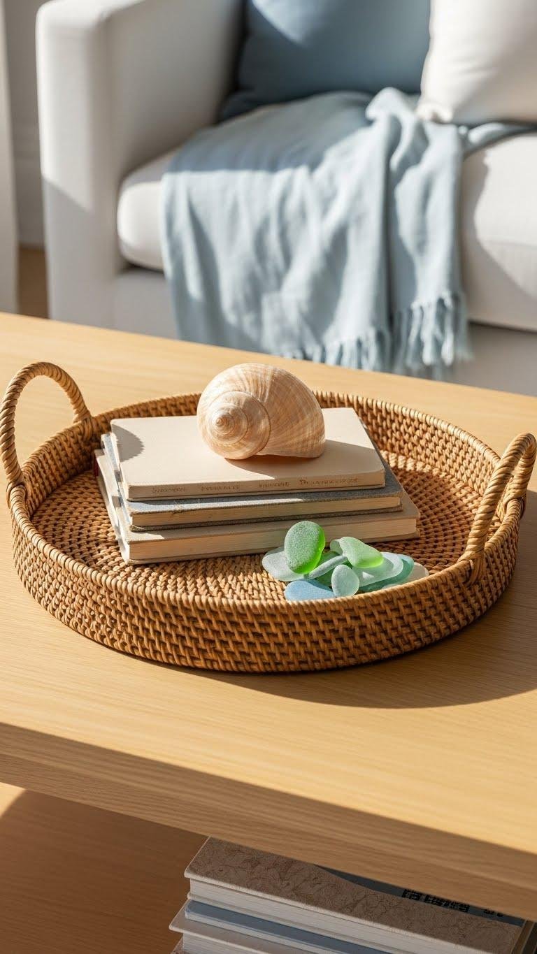 A woven rattan tray brings instant coastal ease to your coffee table, its warm texture and organic weave grounding light, breezy accents. You place a braided handle tray centrally, arranging a stack of travel journals, a sculptural shell, and a small cluster of sea glass accents for color. The composition feels effortless, curated, and freeing — inviting you to relax and roam in memory.