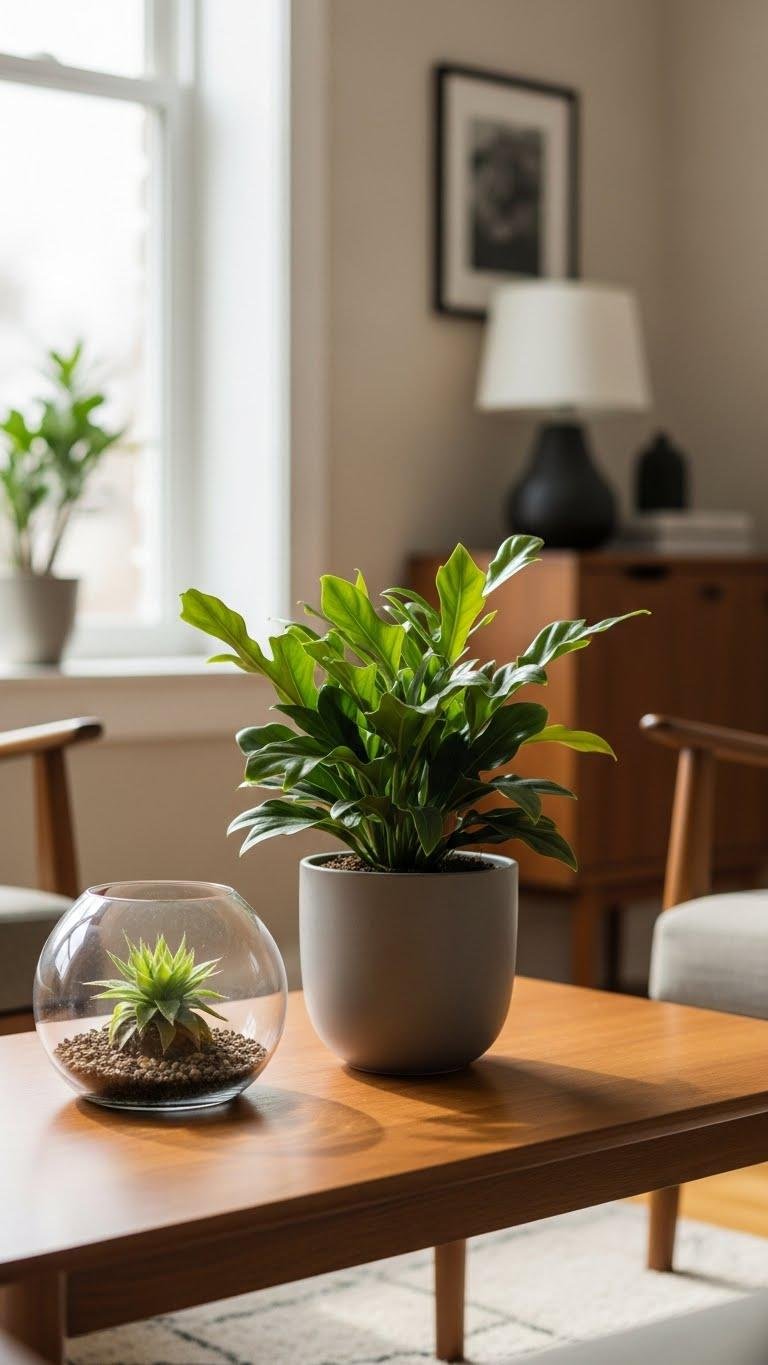 Anchoring your coffee table with a single lush plant creates a focused, living centerpiece that instantly enlivens the room. Choose an air purifying specimen in a sculptural pot or a glass terrarium centerpiece to combine form and function. You’ll enjoy clear visual impact, low-maintenance growth, and a sense of liberated calm — a bold, personal statement that feels intentional, fresh, and effortless.