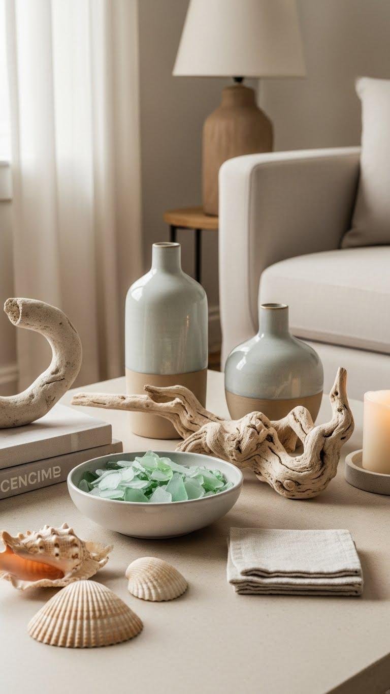 You’ll balance a low ceramic bowl of sea glass against sculptural driftwood accents, add a linen coaster and a single candle, and let open space convey easy, unconfined living.