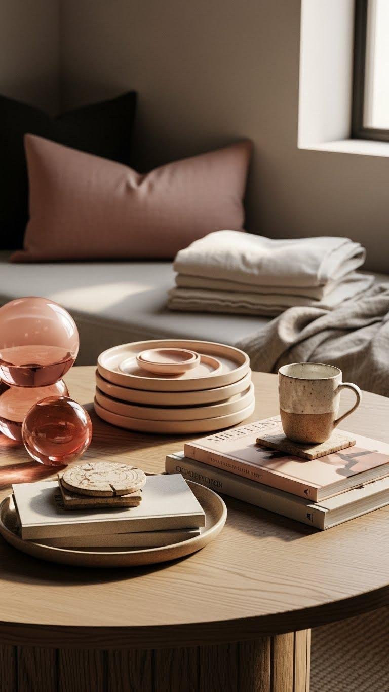 After the soft geometry of pink glass orbs calms the eye, you can introduce stacked trays and books on a round table to add structure without returning to rigid angles.