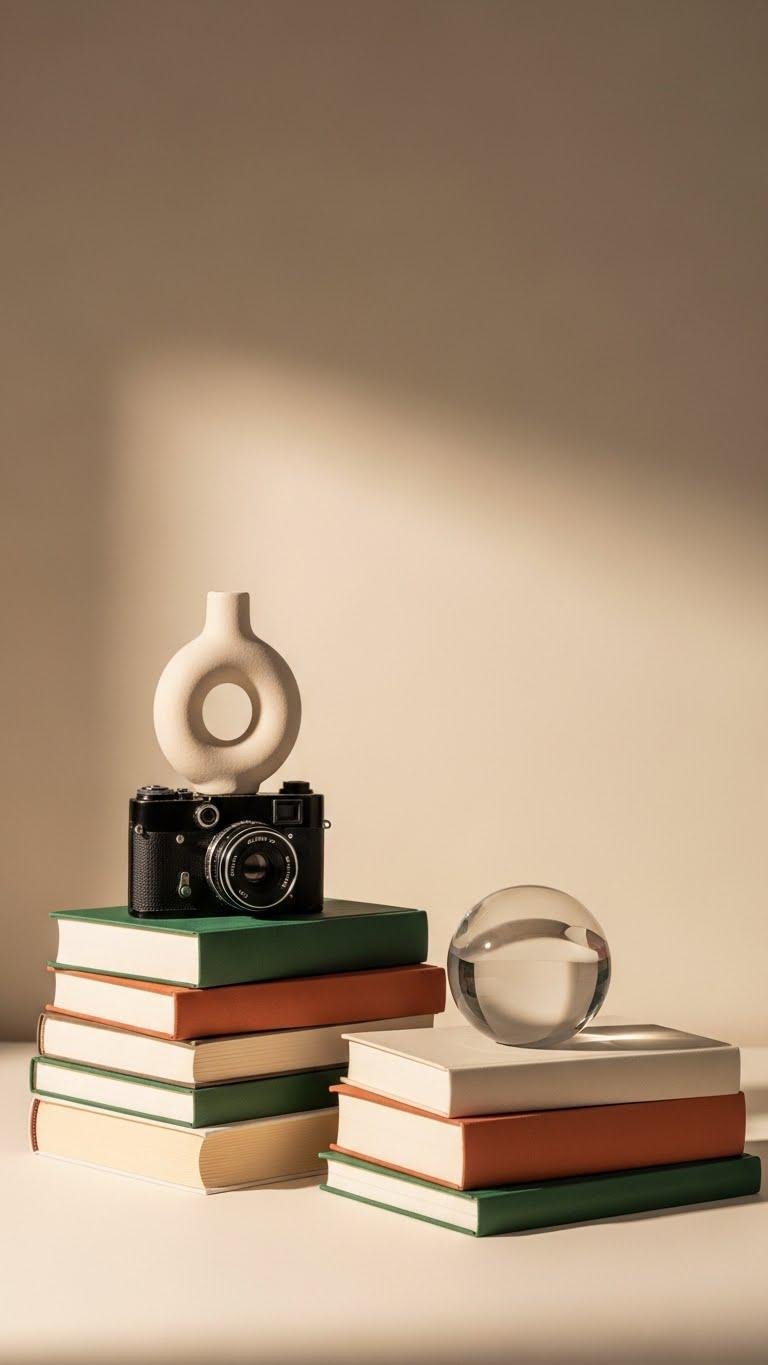 Start by arranging two or three small stacks of books to create varied heights, then top one stack with a single statement object—think a sculptural ceramic, a vintage camera, or a bold glass orb. You’ll favor staggered heights and textured covers, letting negative space and color anchor each vignette.