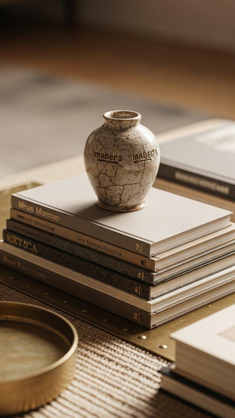 Carry the reflective energy of metallics into a softer, more grounded vignette by anchoring a small stack of books and crowning them with a ceramic heirloom. You’ll curate stacked narratives that feel intentional: mix slim art tomes, display heritage ceramics atop pages, and let tactile patina invite touch. Choose pieces with clear heirloom provenance so your coffee table reads like a liberated, personal museum.