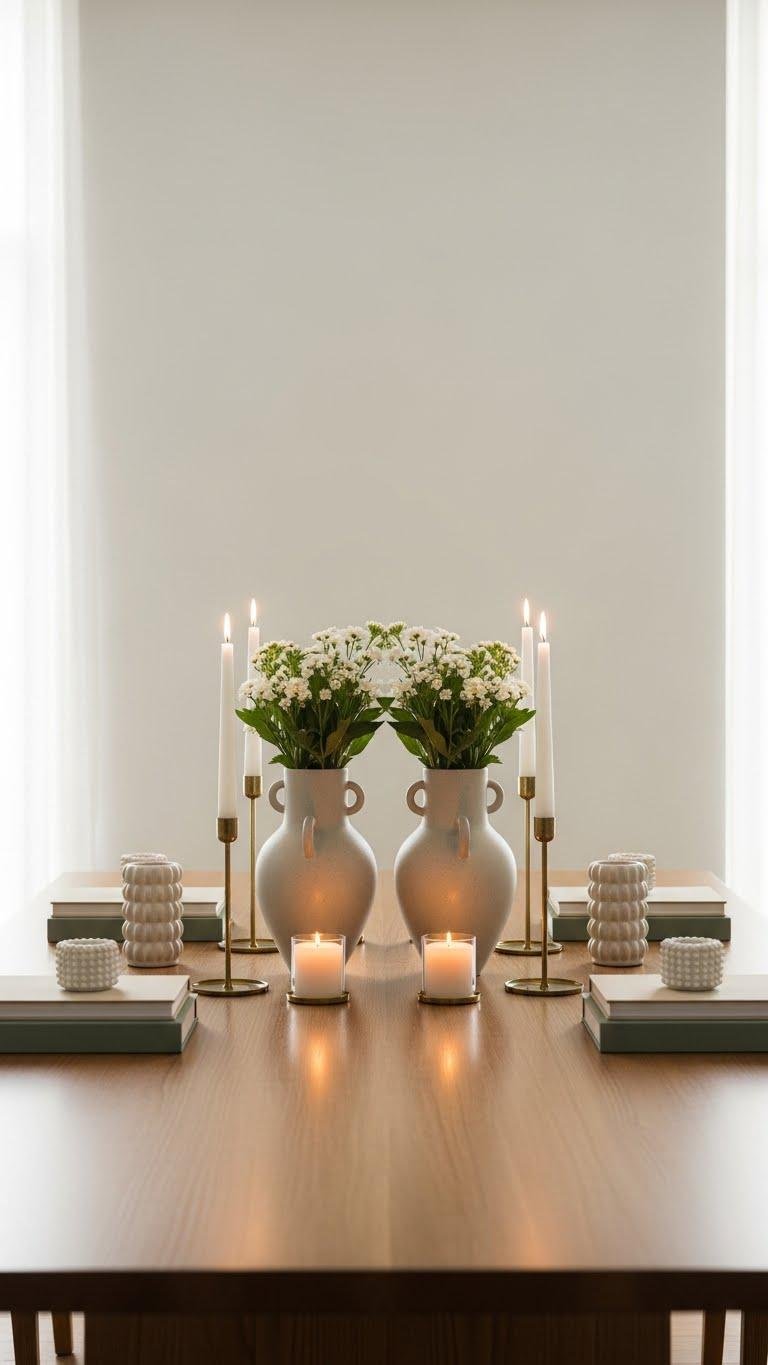 You’ve warmed the surface with natural textures; now bring formal balance by pairing identical or mirrored objects on either side of the table’s centerline. You’ll place twin candles, matching books, or vases with formal florals to create mirror symmetry that reads composed, intentional. Keep negative space crisp, repeat material or color, and let symmetry free the room while feeling disciplined.