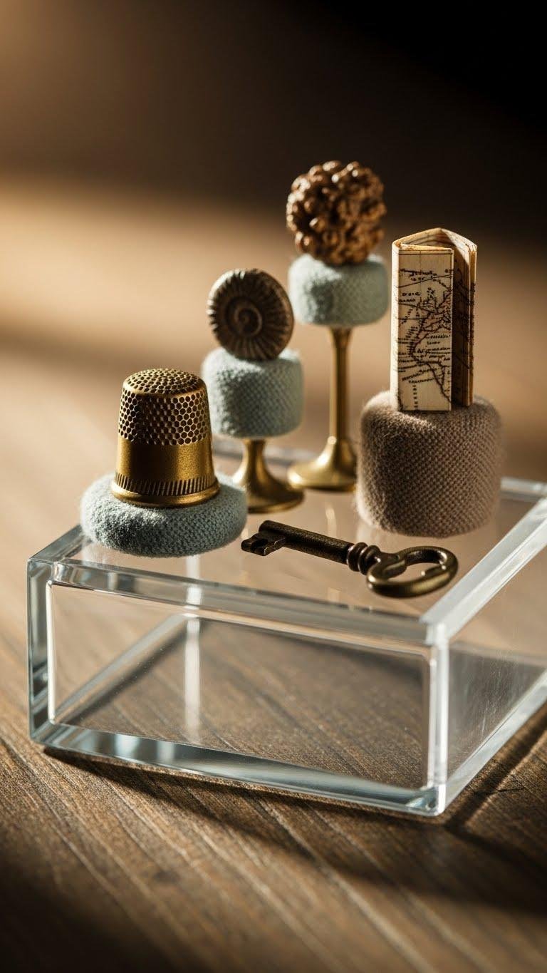 When you tuck a curated mix of small, unexpected objects into a clear glass box, they gain focus and a miniaturized narrative—think a brass thimble beside a fossil, a folded map, and a vintage key arranged at varying heights. You’ll arrange miniature curiosities and scraps of vintage ephemera with intention, leaving negative space, varied textures, and snap decisions that reveal your roaming, unruly taste.
