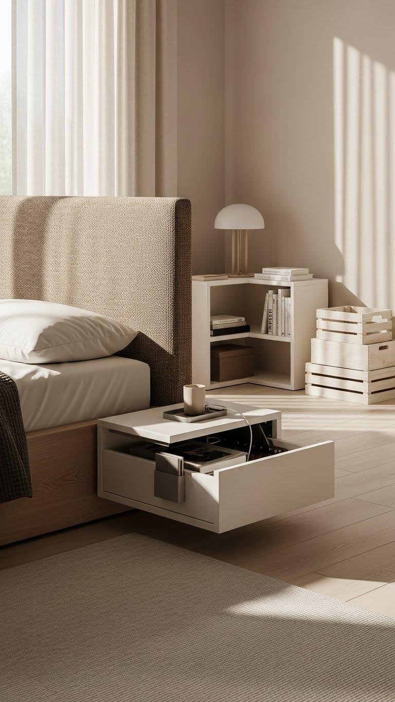 A tall headboard anchors your low bed, and the right nightstands will finish that composed look while keeping what you need within reach. Choose a slim bedside table with drawers, a hidden caddy for chargers, or a corner shelf to save floor space. Stackable crates offer flexible storage and freedom to rearrange, keeping essentials organized and accessible without clutter.