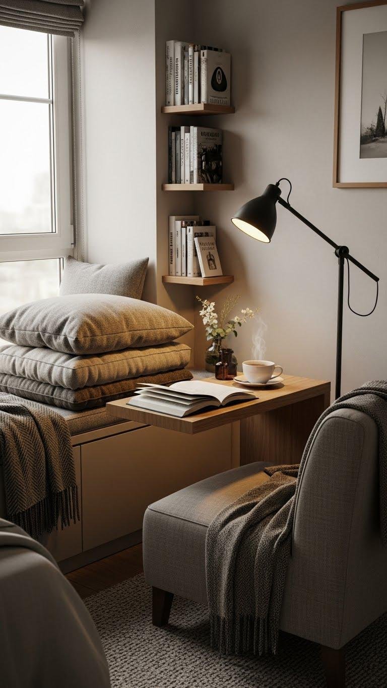 Add a window seat or a lightweight chair, layer with floor cushions, bring focused lighting, and keep a slim shelf nearby so you can escape into books on your terms.