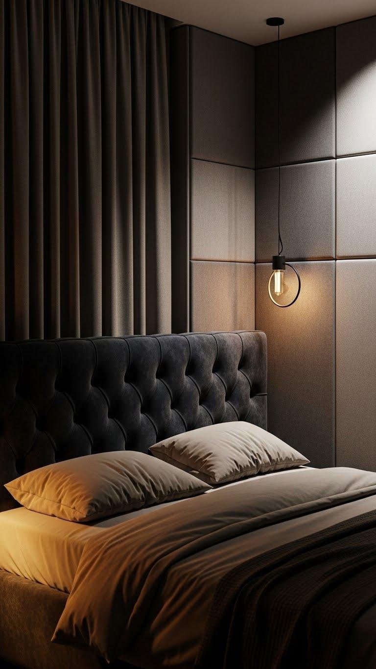 If heavy drapery softens sound and seals in warmth, an upholstered headboard or padded wall panels continue that quiet, cozy feel right where you sleep.