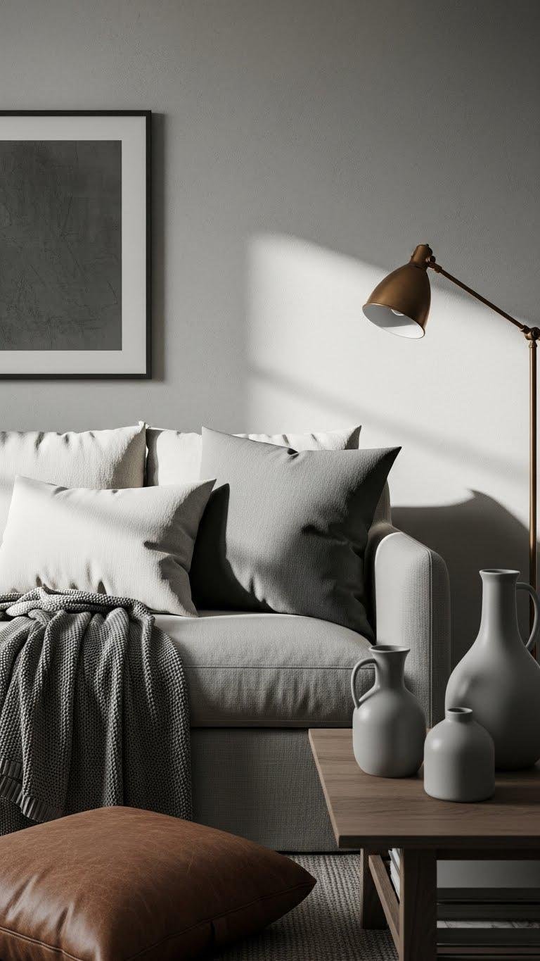 Because a single color family can carry a room, layering varying tones, textures, and finishes within that hue creates depth without discord—pick a base (warm beige, smoky gray, or soft blue), then add lighter and darker variations in linens, a knit throw, a leather cushion, and matte ceramics to build interest while keeping the palette cohesive. You’ll rely on tone variations and subtle contrast accents to stay calm yet expressive.