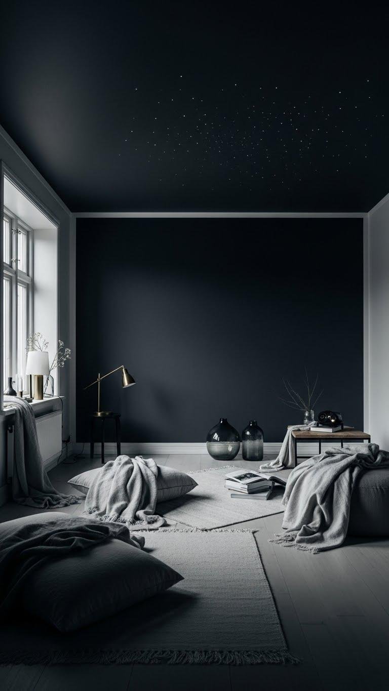 When you want drama without clutter, a dark accent wall or moody ceiling anchors the room and sharpens its proportions. Choose matte plaster for depth and tactile warmth; paint edges crisp to keep lines clean. You’ll balance intensity with light textiles, reflective accents, and a starry projector for night atmosphere. The result feels bold, intimate, and liberating without excess.