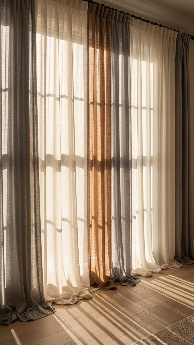Often you’ll soften harsh sunlight and add instant warmth by hanging draped curtains that skim the floor and diffuse light. You’ll choose breathable fabrics and sheer layers to keep views open while achieving ambient filtering. Hang rods higher than the frame, let panels puddle slightly, and mix textures for depth. The result: a relaxed, liberated room that feels private without feeling closed in.