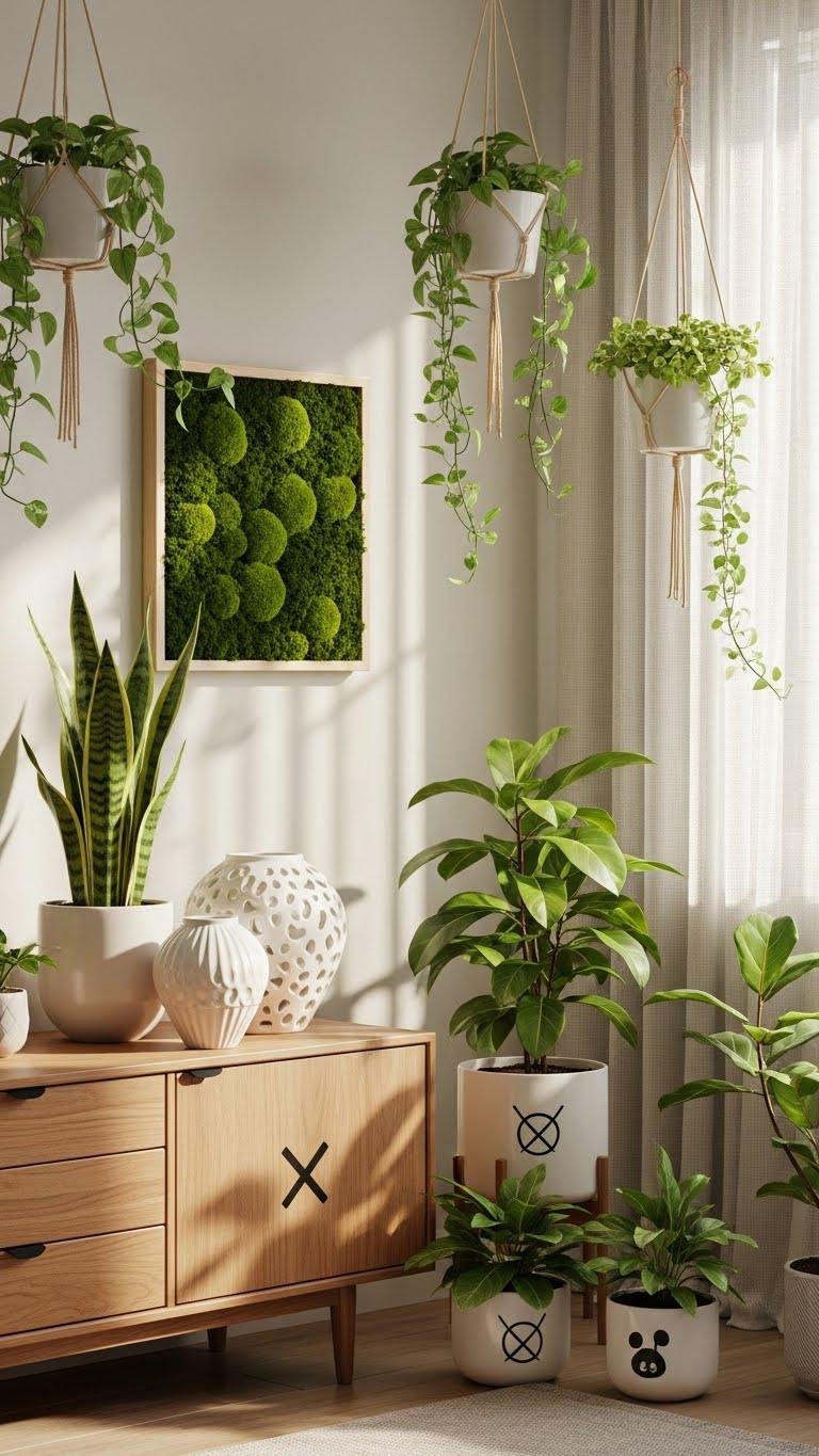 You’ll choose air purifying species and pet friendly greenery to boost wellbeing without worry. Mix hanging planters for vertical interest, sculptural pots for contrast, and moss artwork for low-maintenance serenity.