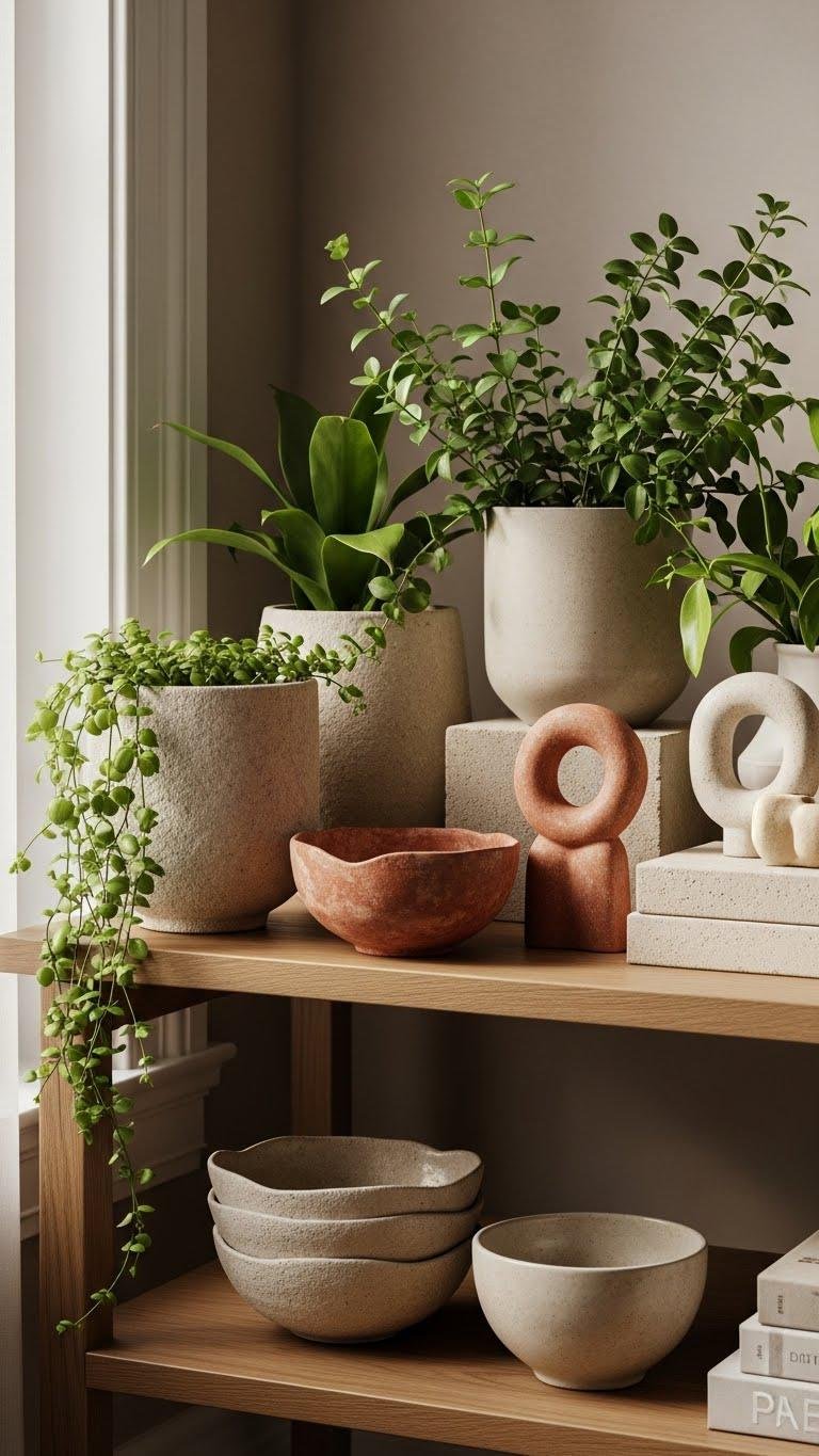 Embrace soft neutrals, natural wood tones, and clean lines. Choose minimalist ceramics as sculptural accents and layer muted textiles for comfort without clutter.