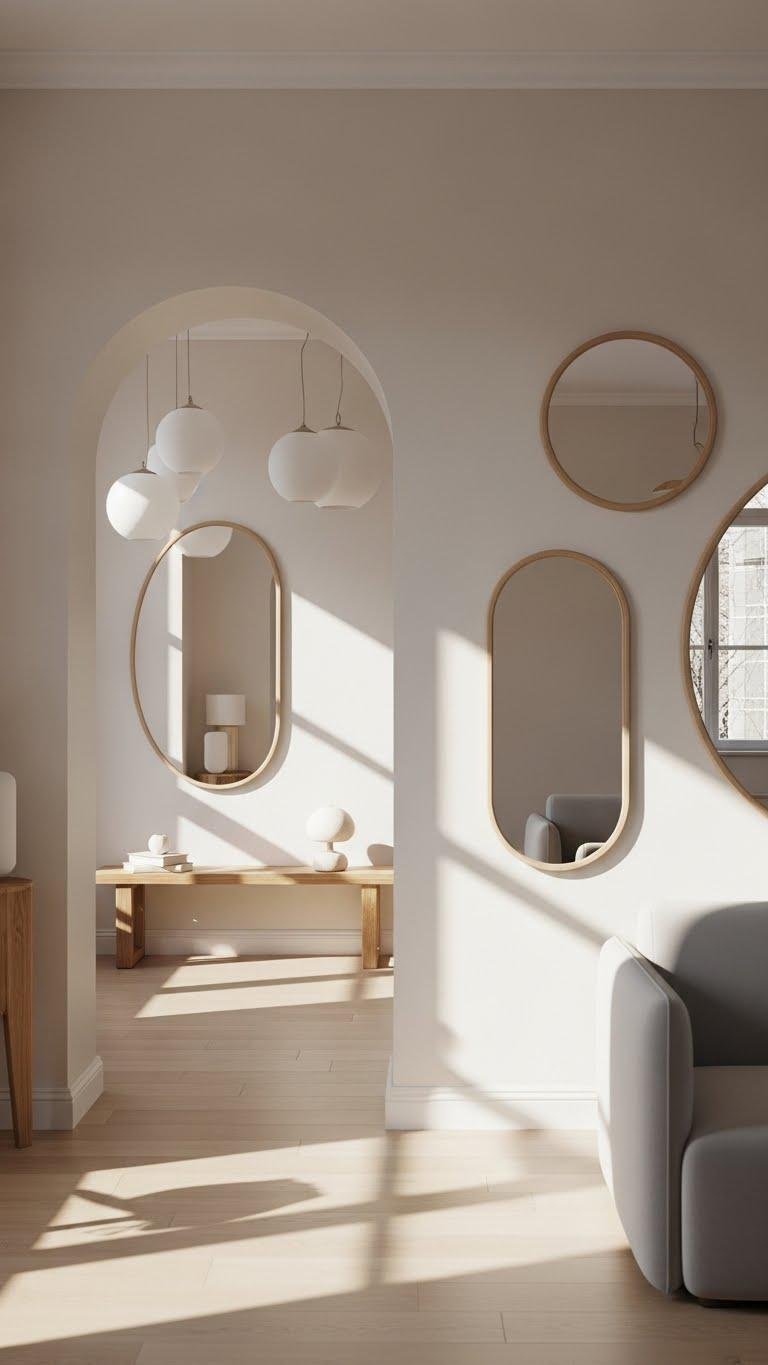 You’ll introduce arched mirrors to reflect light and expand space, while rounded thresholds ease shifts between rooms.