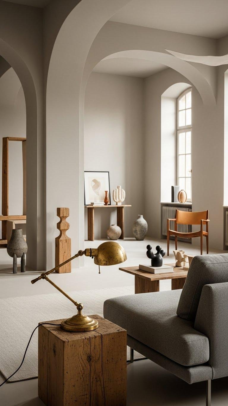 After softening structural lines with arches and curves, bring character in with a few well-chosen vintage pieces set against a modern-minimal backdrop. You’ll create contrast through patina pairing: a worn brass lamp, raw wood table, and streamlined sofa. Embrace thrifted modernism by hunting for sculptural objects that respect negative space. Let each find feel deliberate, freeing the room to breathe and express you.