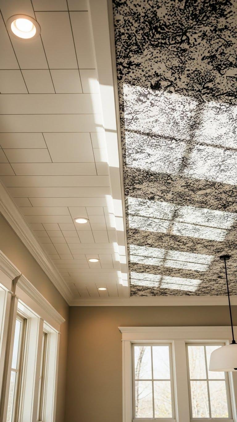 Bring the eye upward by installing wood-panel or wallpapered ceilings—it’s an easy way to add warmth, texture, and architectural interest without crowding your floor plan. Choose shiplap ceilings for crisp, airy lines or go bold with patterned flocking to make a liberated, cozy statement. You’ll create depth and personality while keeping the room open, relaxed, and distinctly yours.